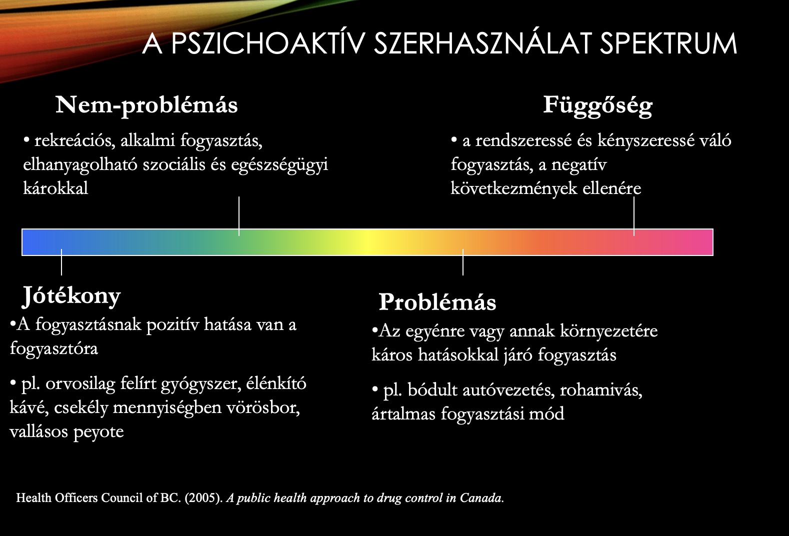 A drogfogyasztásról azonban sokkal inkább úgy kellene gondolkodnunk, mint spektrumról (lásd az ábrán).