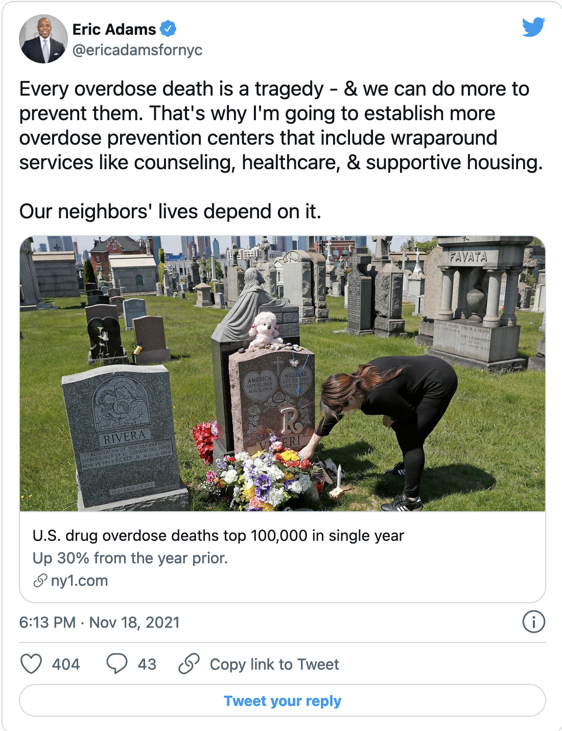 New York most leköszönő polgármestere, Bill de Blasio még 2018-ban kezdett el kampányolni a felügyelt drogfogyasztói szobák mellett, és vezetésének utolsó heteiben hozta meg a döntést a két program megnyitásáról. Közleményében hangsúlyozta, hogy “évtizedek kudarcai után most végre egy okosabb megközelítésre nyílik lehetőség.” Arra kérte ezenkívül a hatóságokat, hogy ne zavarják meg a felügyelt drogfogyasztói szobák működését. A város öt ügyésze közül négy (Michael McMahon Staten Island körzeti ügyész kivételével) támogatja az ártalomcsökkentő programokat, akárcsak az új polgármester, Eric Adams.