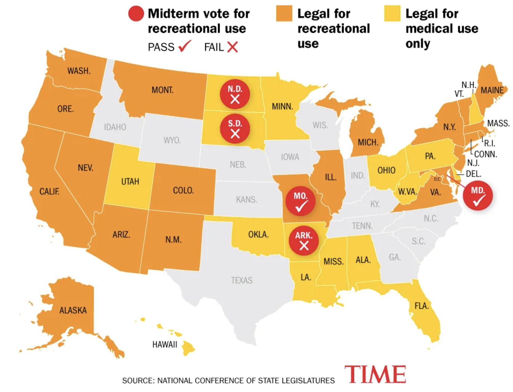 Az amerikai választásokon szokás szerint nem csak szenátorokról, képviselőkről és kormányzókról döntenek a választópolgárok, de ilyenkor szavaznak a különféle népszavazási kezdeményezésekről is. A legutóbbi, 2020-as elnökválasztás mellékvágányán például öt újabb állam tette legálissá a kannabisz fogyasztását a 21 évesnél idősebb felnőtt polgárok számára.