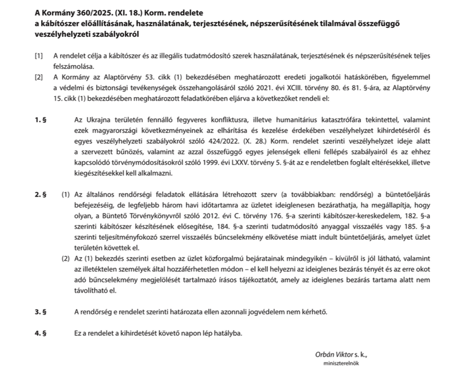 2025. november 18-án a kormány újabb veszélyhelyzeti rendeletet adott ki. A címe: „a kábítószer előállításának, használatának, terjesztésének, népszerűsítésének tilalmával összefüggő veszélyhelyzeti szabályokról”. A rendelet, a terebélyes címével ellentétben, valójában mindössze egyetlen új eszközt vezet be: a rendőrség ideiglenesen (legfeljebb három hónapra) bezárathat bármilyen üzletet vagy vendéglátóhelyet, ha ott „megállapítható”, hogy kábítószer-terjesztéssel kapcsolatos bűncselekmény miatt eljárás folyik.